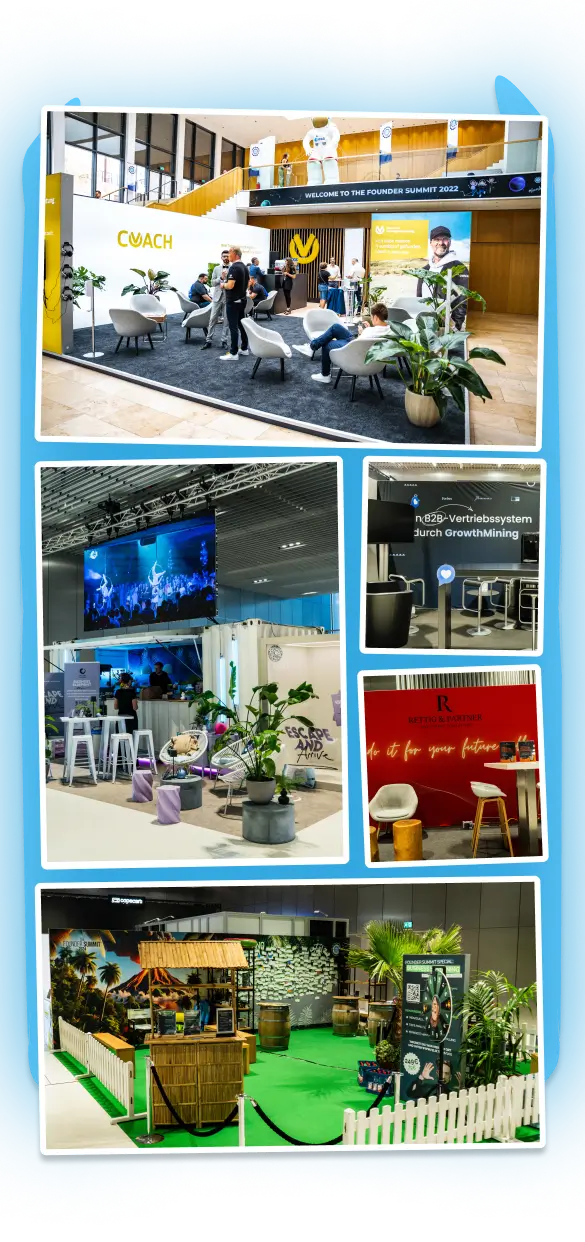 Werden Sie Teil einer außergewöhnlichen Expo mit über 150 führenden Ausstellern! Unsere Expo- Halle ist das pulsierende B2B Herz des Founder Summit – der zentrale Treffpunkt, an dem Innovationen, Produkte und Dienstleistungen live präsentiert werden. Als Aussteller haben Sie die einmalige Gelegenheit, direkt mit Tausenden potenziellen Kunden und Geschäftspartnern in Kontakt zu treten. Netzwerken Sie mit über 8.000 Besuchern täglich, knüpfen Sie zudem wertvolle Kontakte zu den anderen Partnern vor Ort und positionieren Sie Ihre Marke im Rahmen eines unvergesslichen Erlebnisses